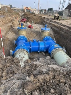 Denys legt alle terreinleidingen aan van 25mm tot 1200mm. Er zitten een aantal cruciale ombouw momenten in waar bestaande waterleidingen onderbroken worden en aangesloten worden op de nieuw aangelegde leiding delen. Dit vergt specifieke kennis op het gebied van drinkwater. InfraMeesters Oost en InfraMeesters West ondersteund aannemer Denys hierin.